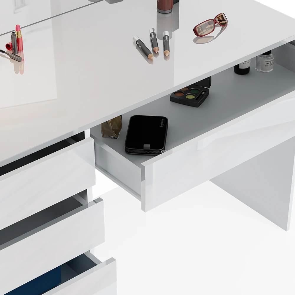- Der Kosmetiktisch mit Spiegel bietet fünf Fachböden, die für eine übersichtliche Aufbewahrung von Kosmetikprodukten sorgen.