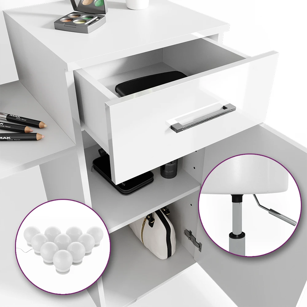 - LIEFERUMFANG: Schminktisch, Hocker, LED-Lichterkette, Montageanleitung, Montagematerial