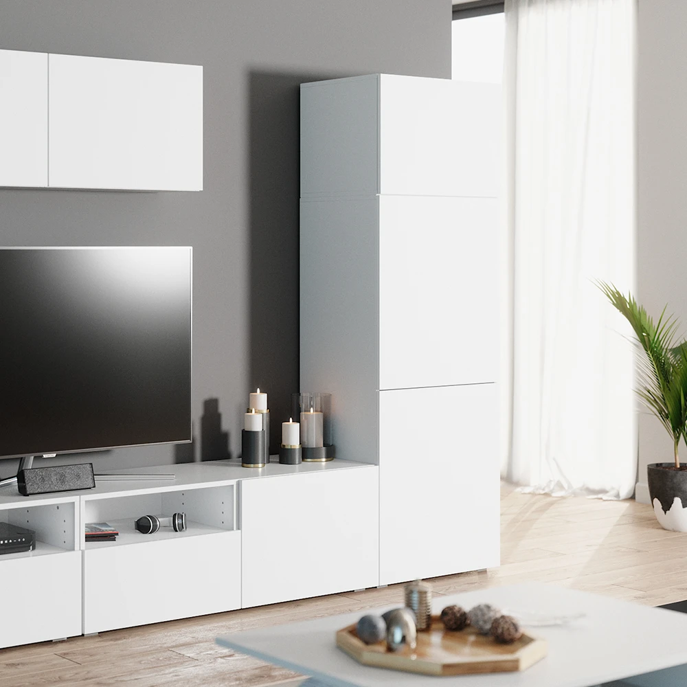 Die hochwertigen Schränke aus dem Compo-Sortiment verfügen über eine breite Palette an Zubehör für die Innenaufbewahrung. Das Design erlaubt es Ihnen, den Schrank je nach Bedarf neu zu kombinieren und zu nutzen. Und ihr Design ist einfach und elegant, so dass sie lange Zeit verwendet werden können. Sie werden überrascht sein, wie viel mehr Sie in diesem Schrank unterbringen können. Die Metallschubladen des Schranks lassen sich dank der Qualitätsscharniere leicht herausziehen. Die Türen schließen sanft und leise mit dem Push-to-Open-System.