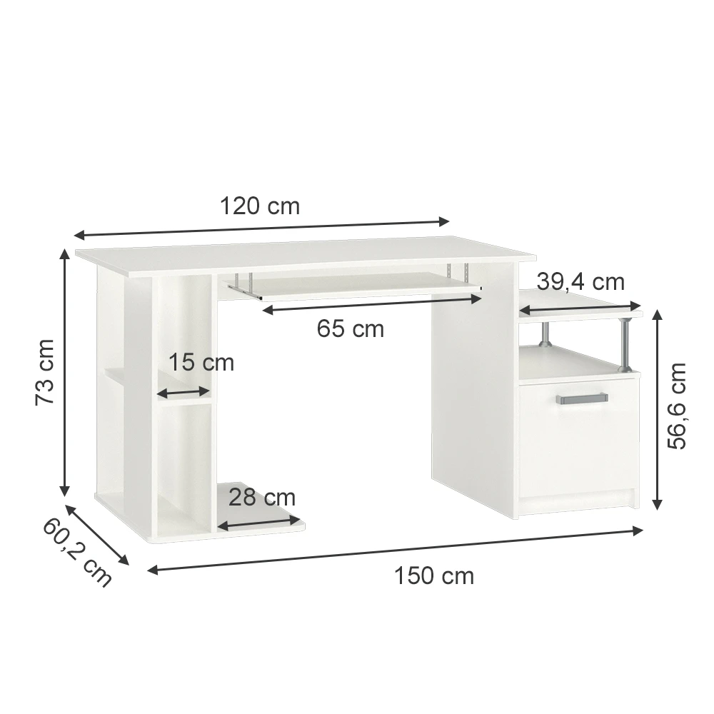 - MAßE: Der Bürotisch mit Stauraum hat folgende Abmessungen: Breite: 150 cm, Höhe: 73 cm, Tiefe: 60,2 cm. Alle detaillierten Größen sind auf den Fotos angegeben.