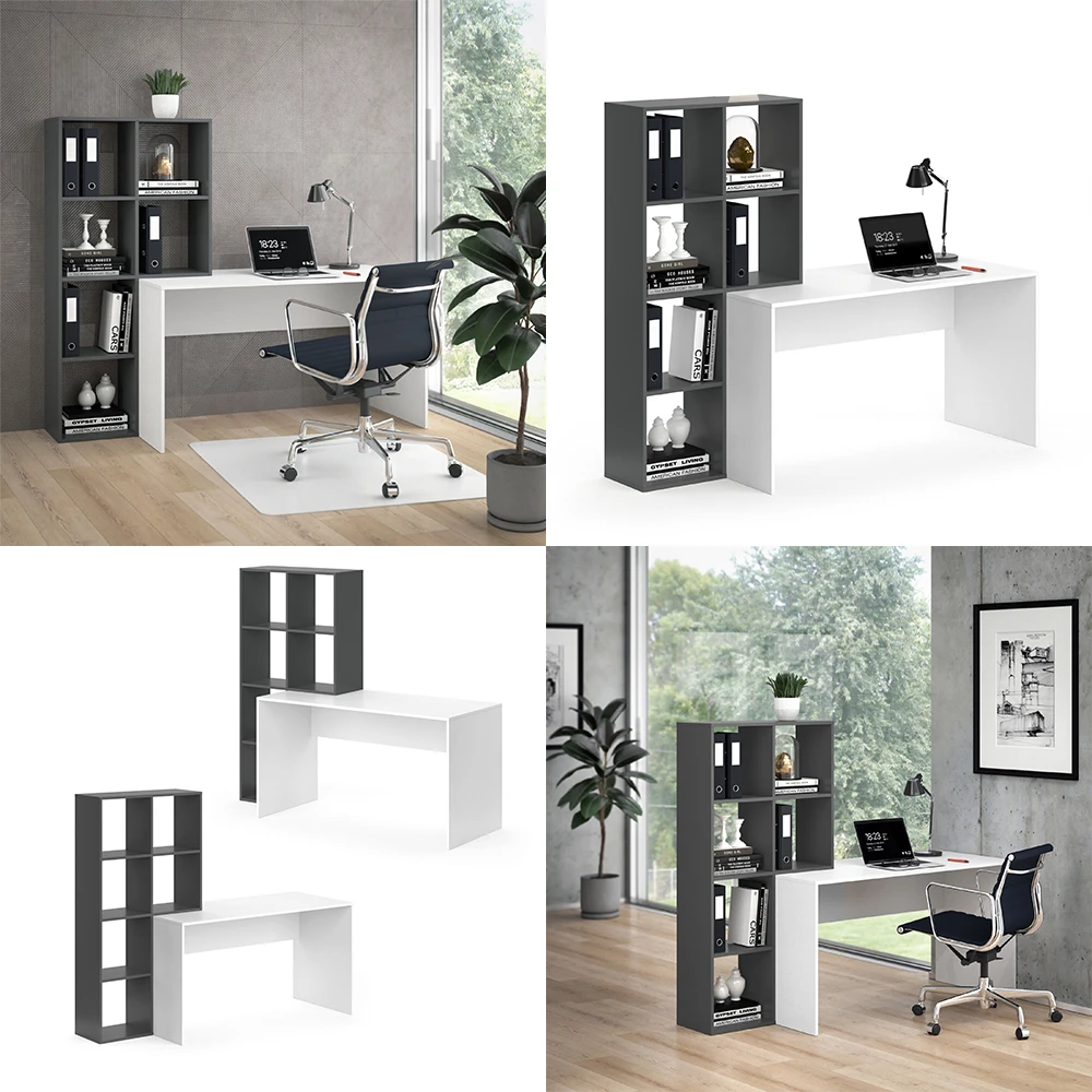 - Der Arbeitstisch für das Büro verfügt über ein praktisches Seitenregal mit 6 Fächern, das ideal für kleine Räume ist und dabei platzsparend funktioniert.