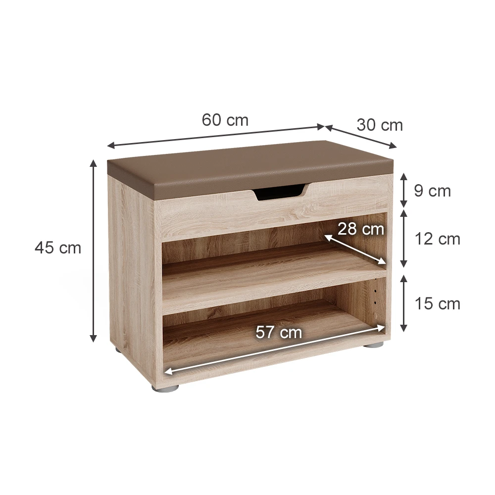 - MAßE: Der Schuhschrank mit Sitzbank hat eine Breite von 60 cm, eine Höhe von 45 cm und eine Tiefe von 30 cm. Alle detaillierten Größen sind auf den Fotos angegeben.