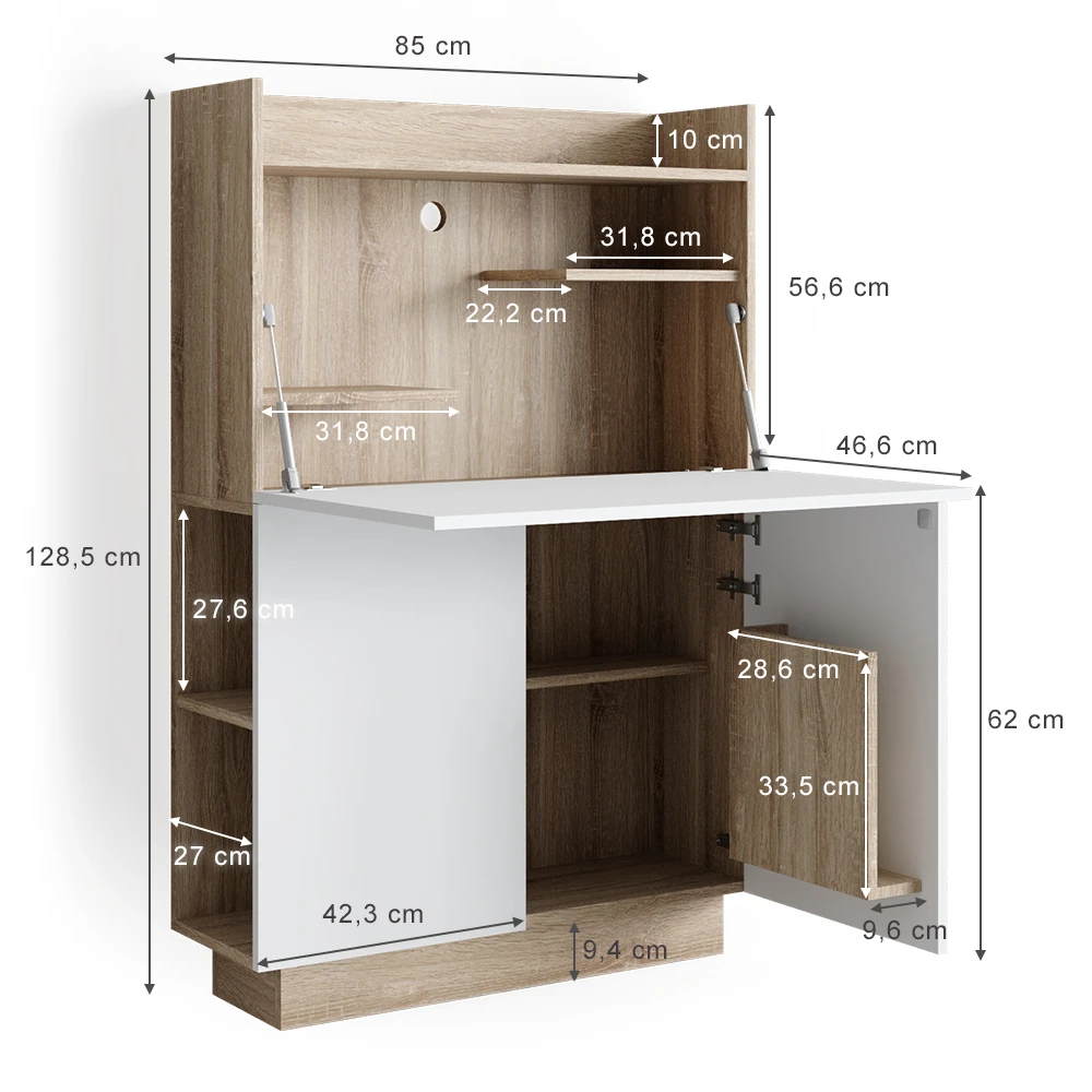 - MAßE: Der Bürotisch mit Stauraum hat eine Breite von 85 cm, eine Höhe von 118,9 cm und eine Tiefe von 27 cm. Alle detaillierten Größen sind auf den Fotos angegeben.