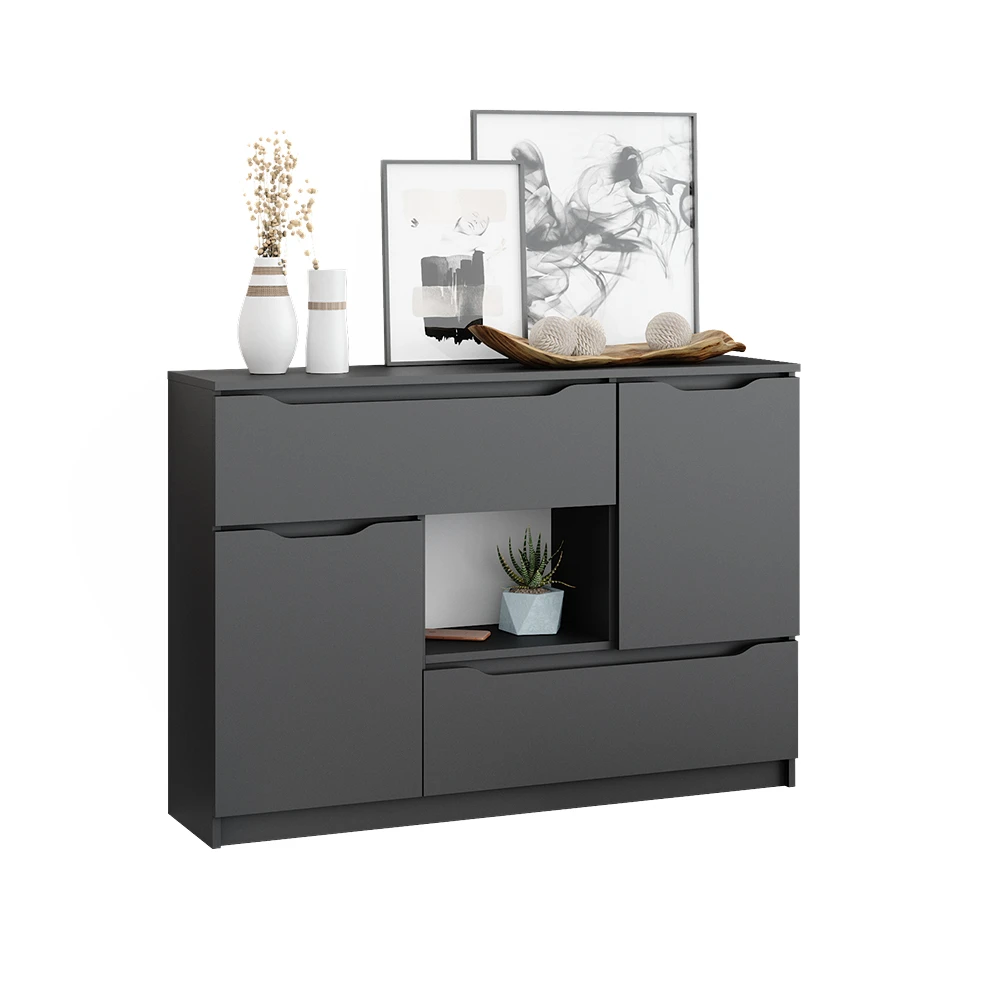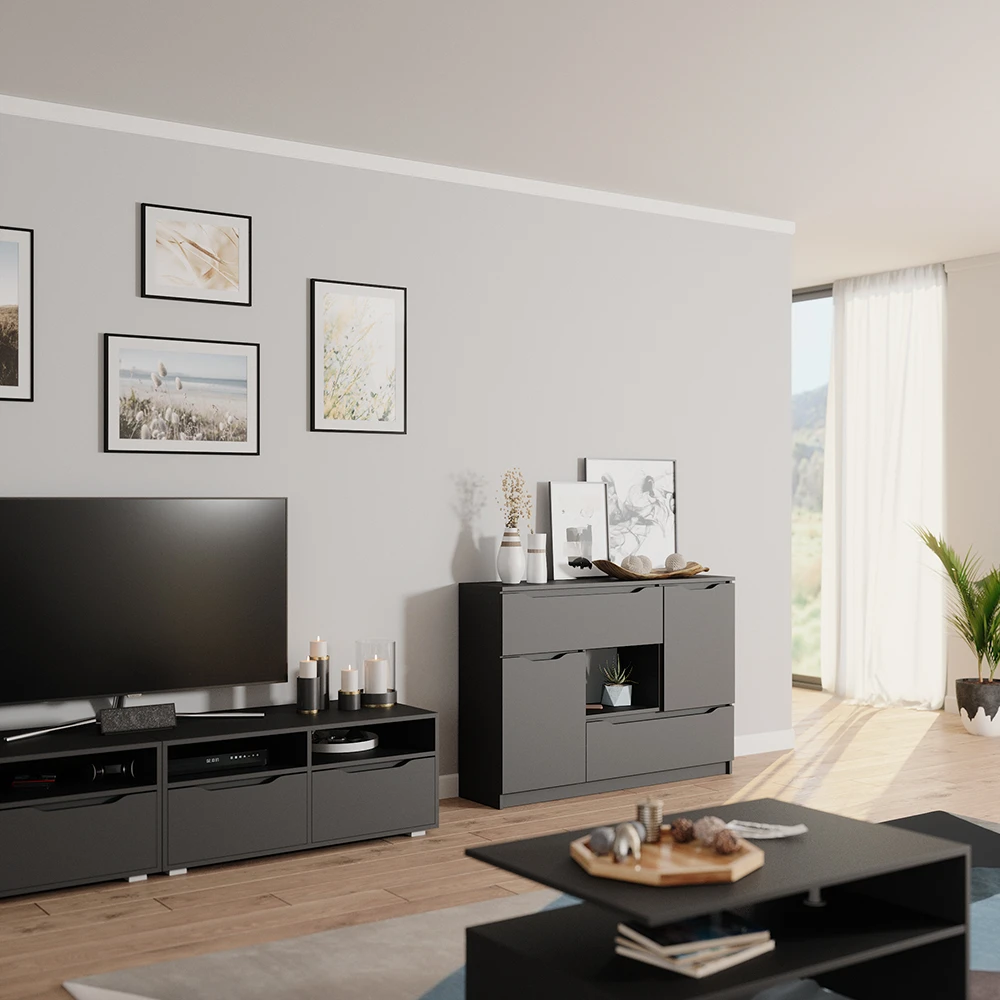 Das Sideboard Ruben ist das perfekte Möbelstück für alle, die Wert auf ein minimalistisches Design und viel Stauraum legen. Das Modell ist Teil der Ruben-Serie und bietet zahlreiche Optionen für jeden Raum. Ob als Kommode mit Schubladen, Kommodenschrank oder Anrichte – das Sideboard ist ein wahrer Allrounder für Wohn- und Schlafzimmer. Die Schubladen sind geräumig und bieten ausreichend Platz für Kleidung, Wäsche, Unterlagen und vieles mehr. Dank der klaren Linienführung fügt sich das Sideboard nahtlos in jedes Raumkonzept ein und verleiht dem Ambiente einen edlen Touch. Mit dem Sideboard Ruben bringen Sie nicht nur Ordnung in Ihr Zuhause, sondern auch zeitlose Eleganz.