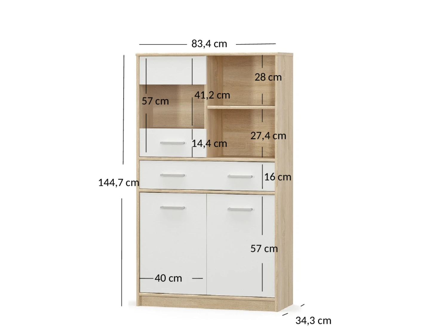- MAßE: Die Kommode mit Türen hat eine Breite von 83 cm, eine Höhe von 145 cm und eine Tiefe von 34 cm. Alle detaillierten Größen sind auf den Fotos angegeben.