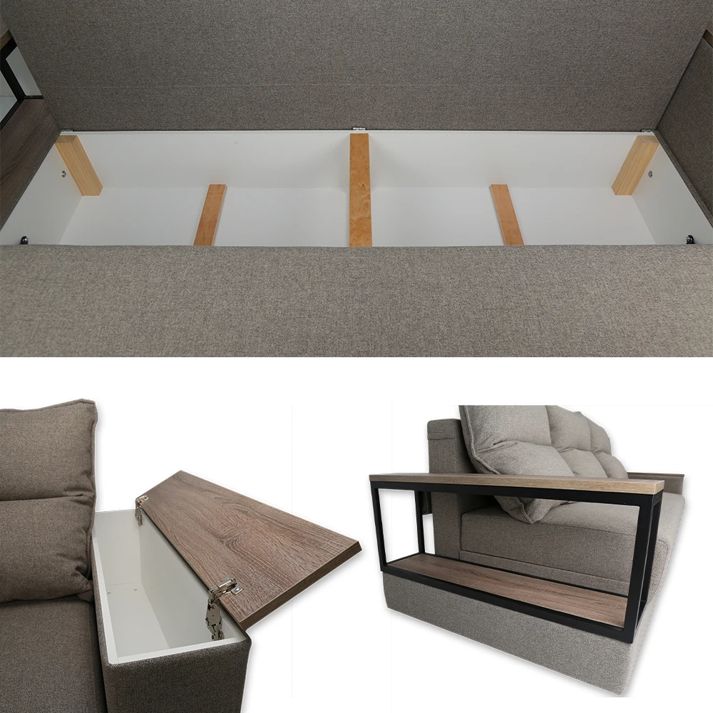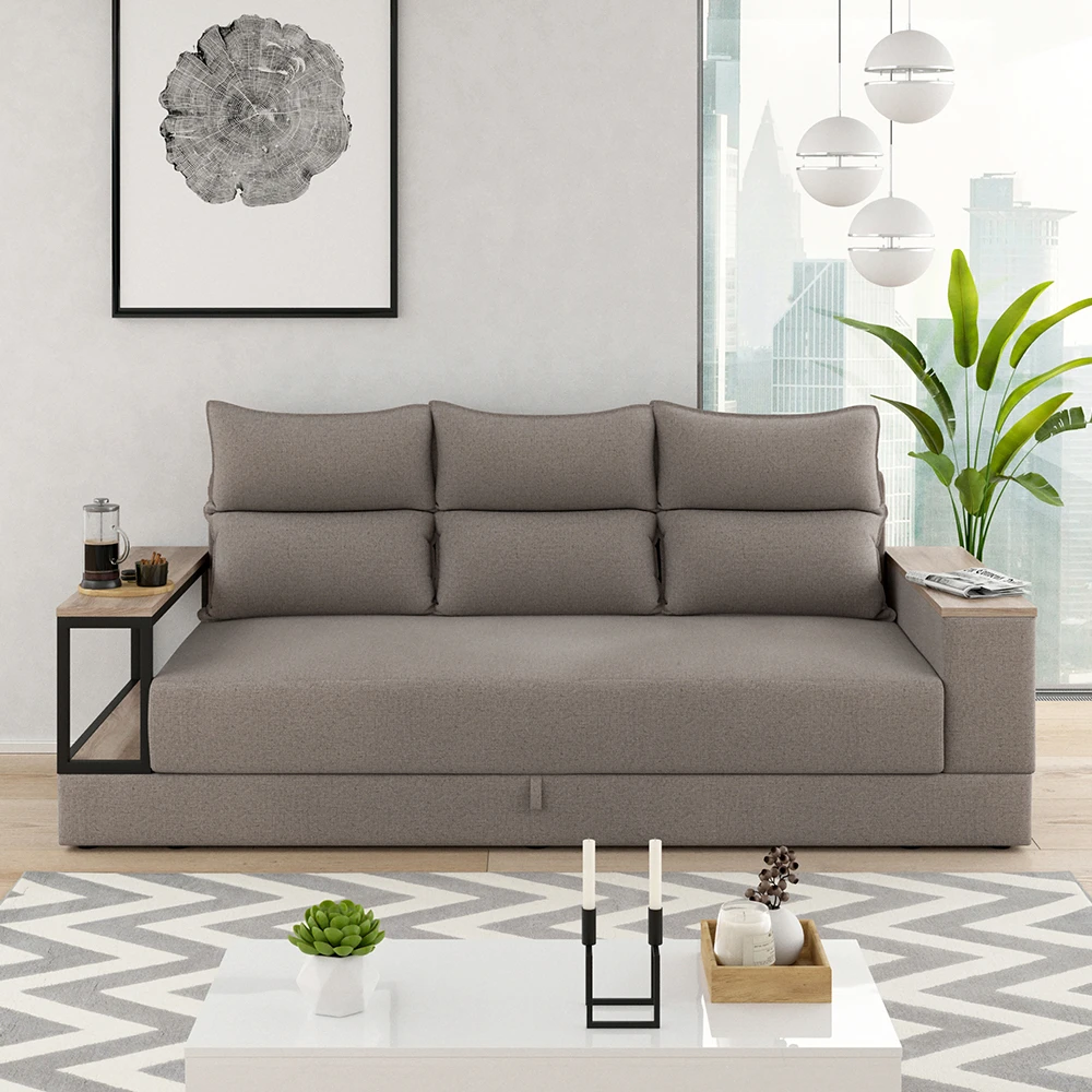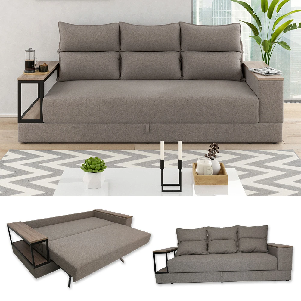 - Die Schlafcouch bietet mit ihren gepolsterten Armlehnen aus Spanplatten bequemen Sitzkomfort und lässt sich einfach zu einer Liegefläche ausziehen.