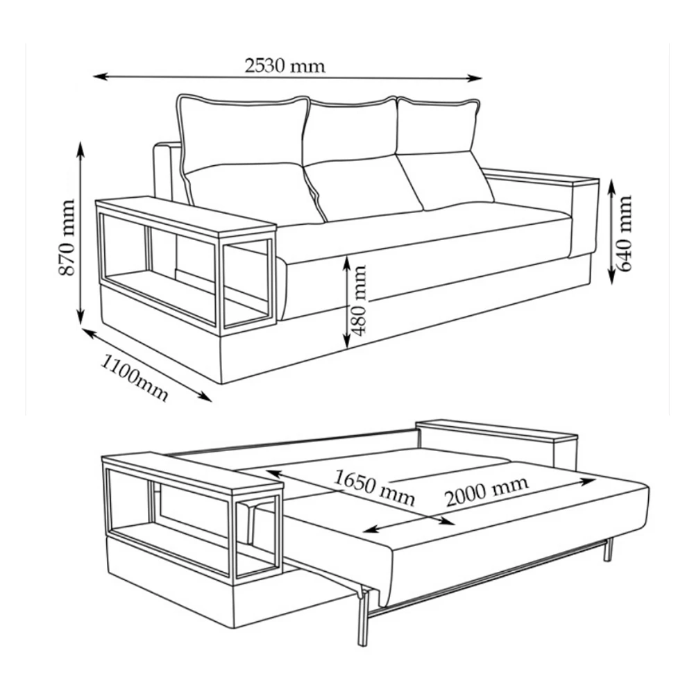 - MAßE: Das Schlafsofa mit Bettkasten hat eine Breite von 253 cm, eine Höhe von 87 cm und eine Tiefe von 110 cm. Alle detaillierten Größen sind auf den Fotos angegeben.