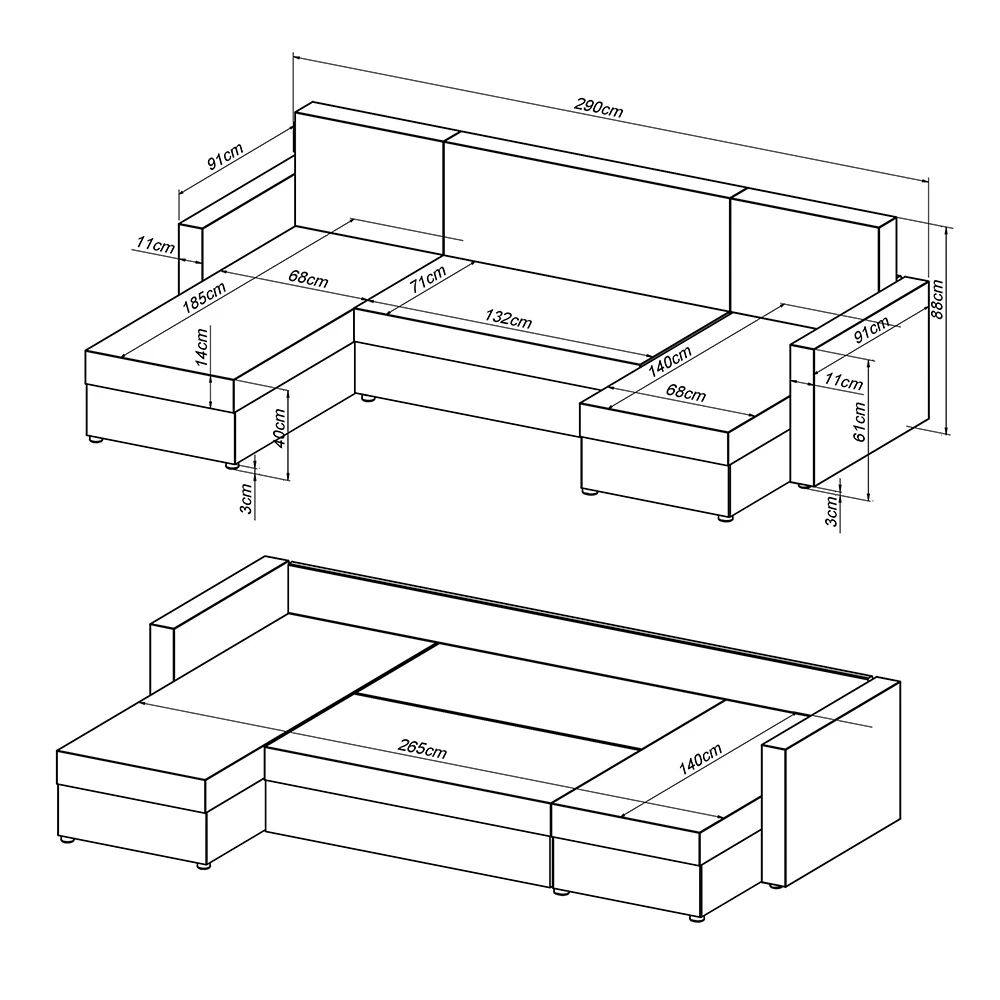- MAßE: Das Ecksofa mit Schlaffunktion hat folgende Abmessungen: Breite: 290 cm, Höhe: 88 cm, Tiefe: 185 cm. Alle detaillierten Größen sind auf den Fotos angegeben.
