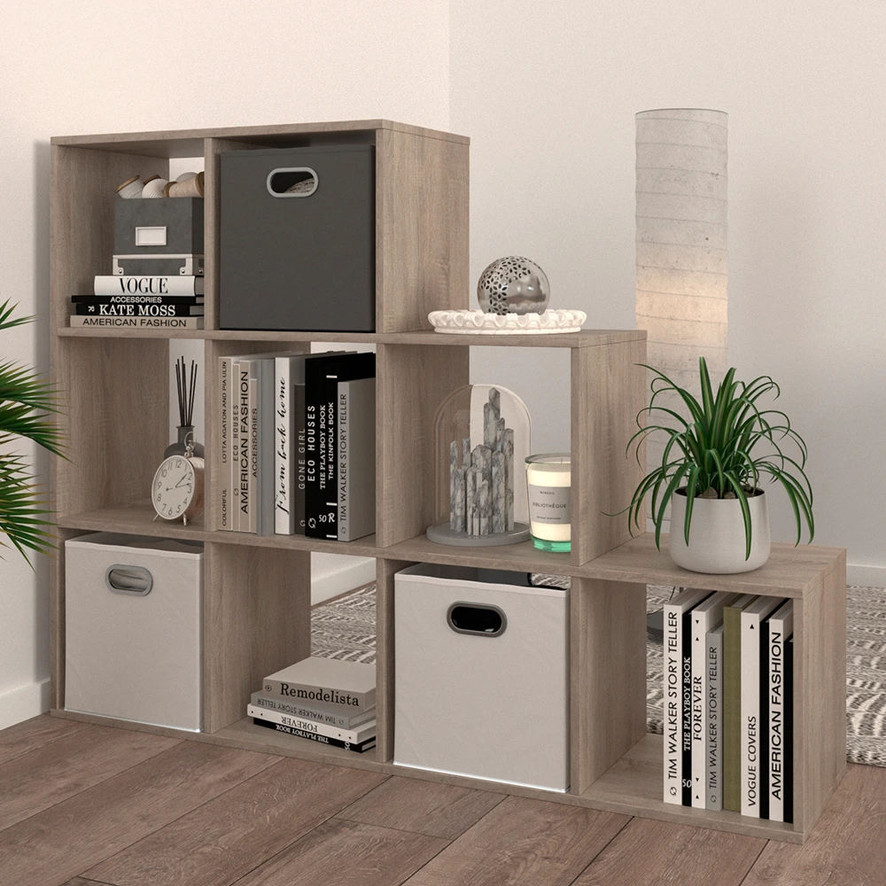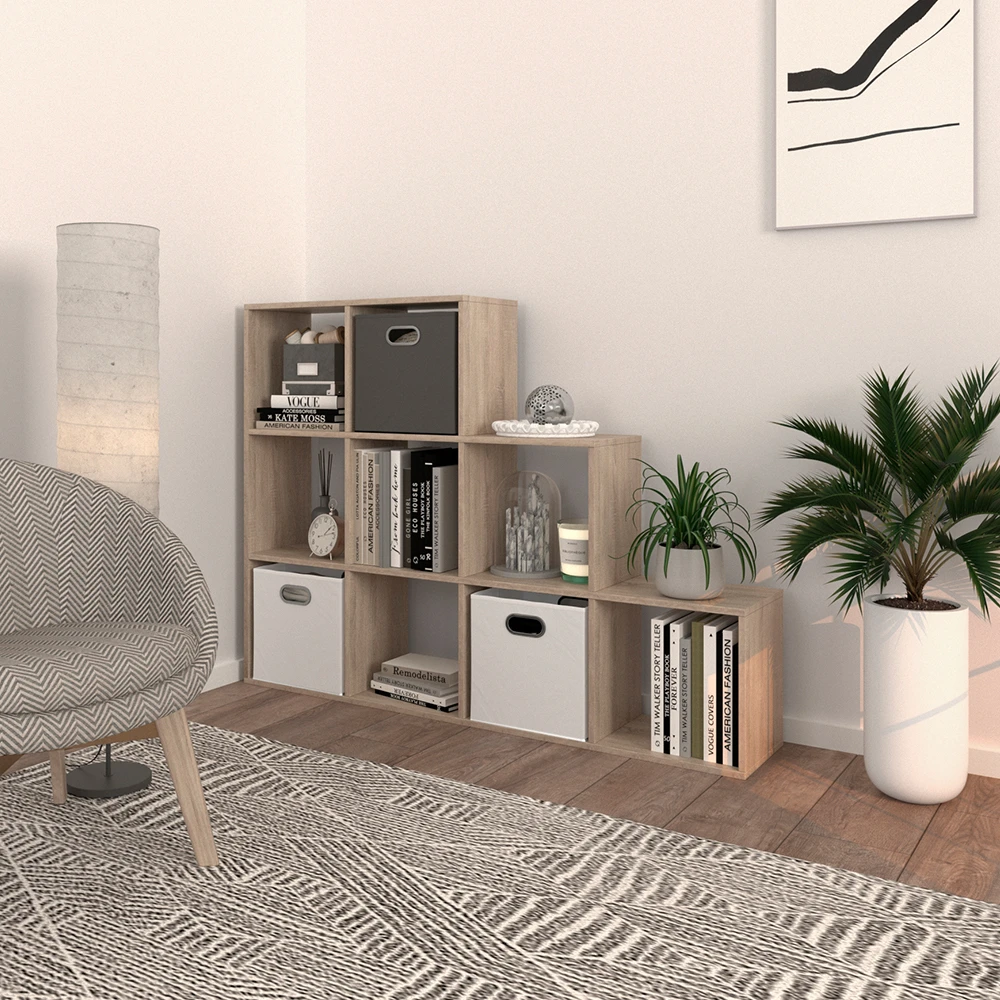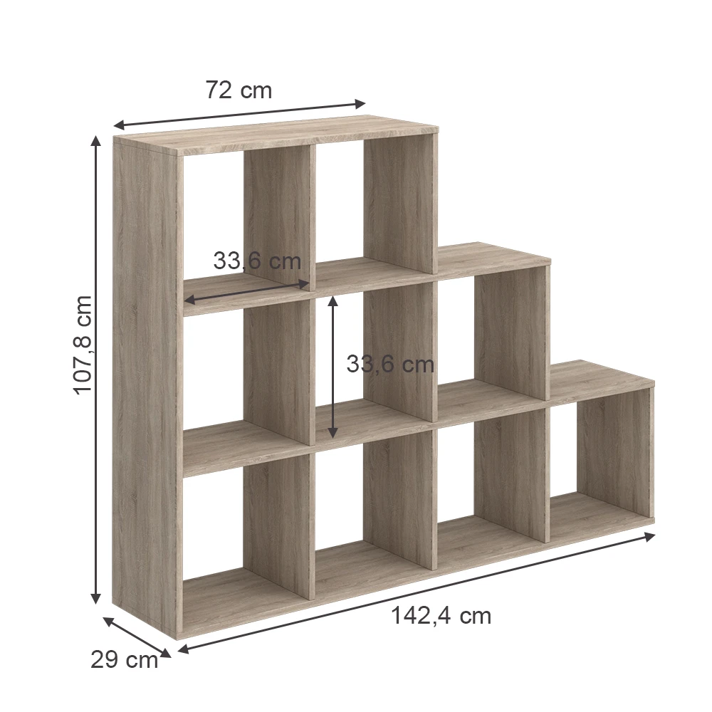 - Das stehende Bücherregal bietet neun offene Ablageflächen in leiterförmigem Design und Kastenregale mit 30×30 cm Größe.