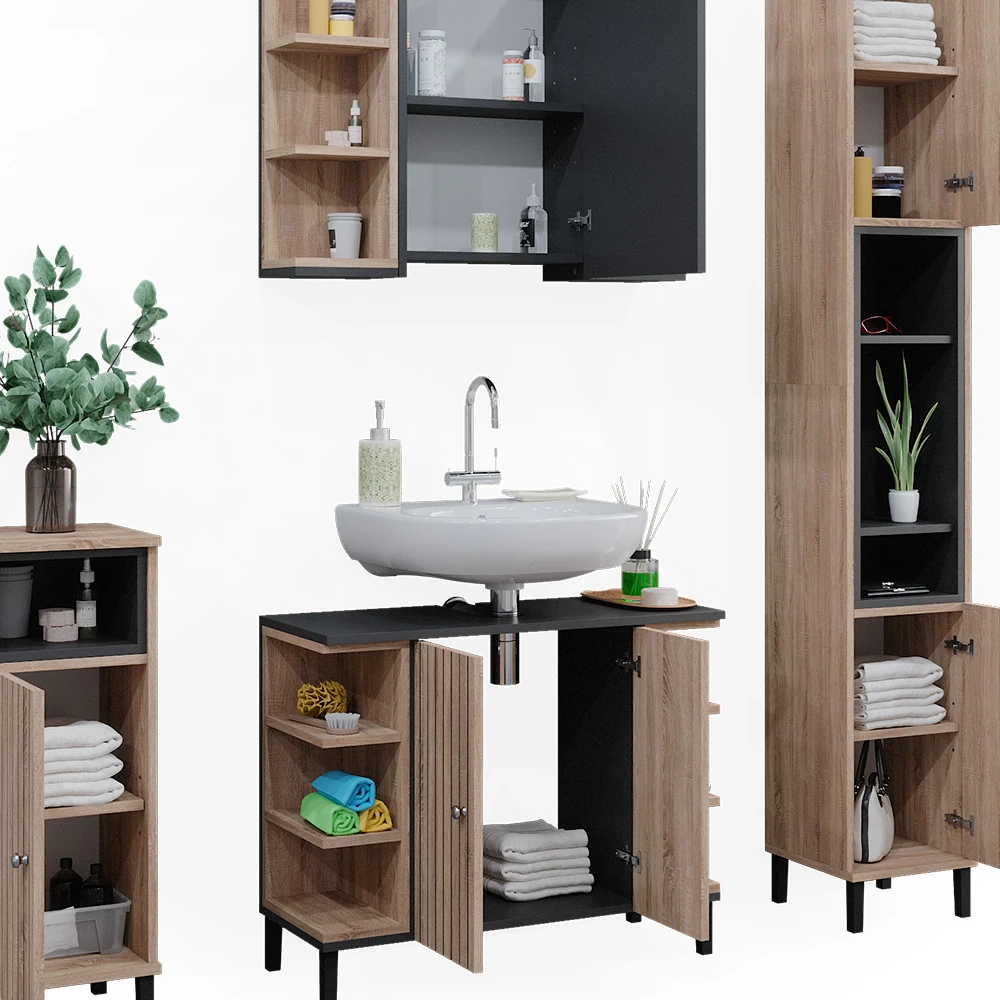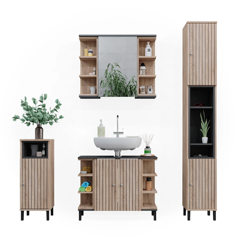 - Erleben Sie das Vicco Badmöbel-Set Aquis in Sonoma-Anthrazit – Ihre moderne Badezimmerlösung. Mit Waschtischunterschrank, Midischrank, Hochschrank und Spiegelschrank schaffen Sie stilvollen Stauraum.