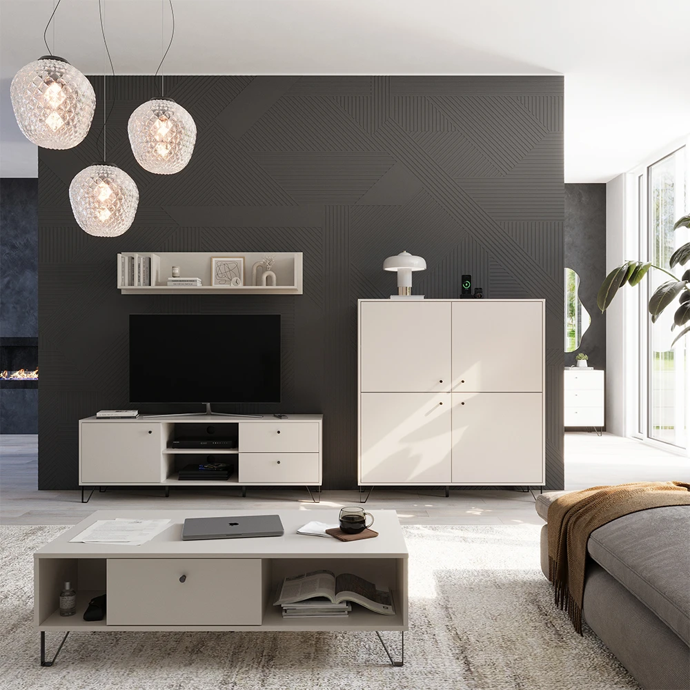 Das Sideboard Aldo bringt mit seinem originellen Design einen Hauch von Individualität in Ihr Zuhause. Mit insgesamt vier Türen bietet es reichlich Stauraum und ist sowohl für das Wohn- als auch für das Schlafzimmer ideal geeignet. Doch das Beste: Das Aldo Sideboard ist Teil einer ganzen Reihe von Möbeln, die perfekt aufeinander abgestimmt sind und somit ein einheitliches Designkonzept ermöglichen. Als Kommodenschrank mit Türen wird das Aldo Sideboard zu einem Multifunktionsmöbel, das in keinem modernen Zuhause fehlen sollte. Bringen Sie mit dem Sideboard Aldo neuen Schwung in Ihre Einrichtung und erfreuen Sie sich an seinem praktischen Nutzen!