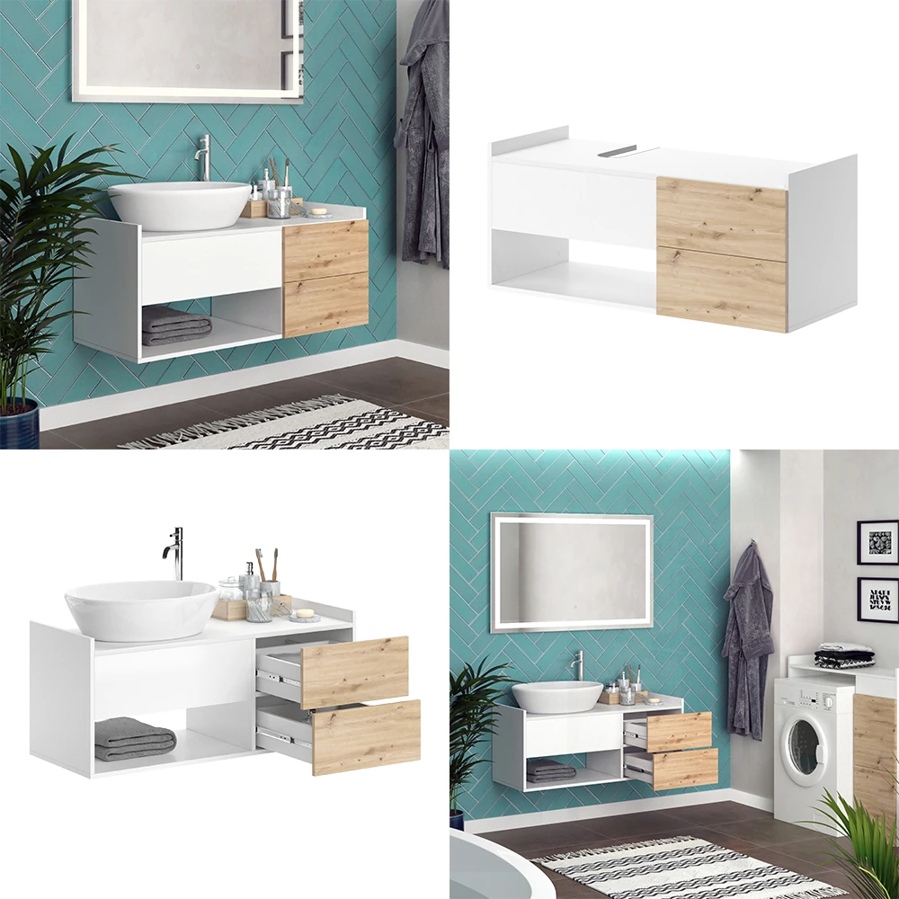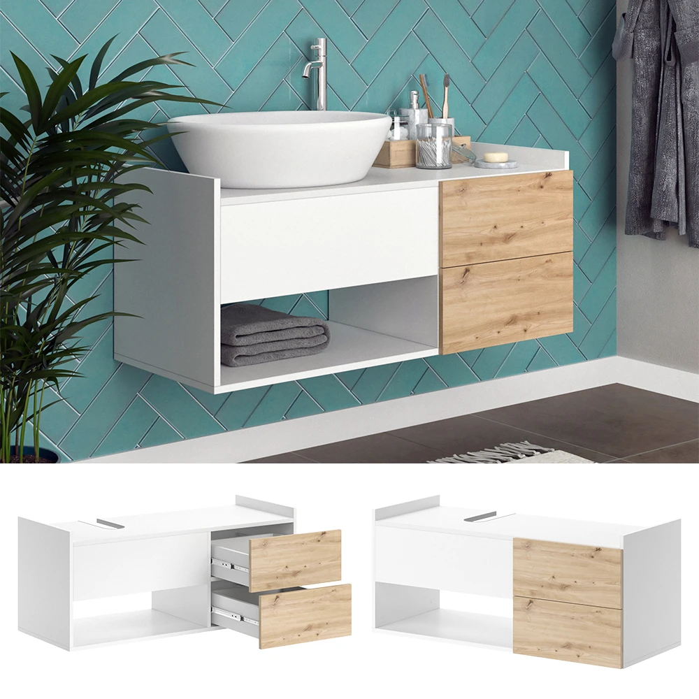 - Der Waschbeckenunterschrank überzeugt mit viel Stauraum: 1 offenes Fach und 2 Schubfächer mit „Push-to-Open“- Funktion. Das innovative Design schafft einen funktionalen Waschplatz im Badezimmer.