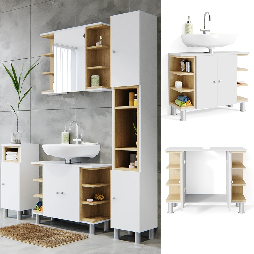 - Der Waschtischunterschrank hat zwei Flügeltüren und sechs offene Einlegeböden. Für einen Siphon ist eine Aussparung vorhanden. Die Füße des Möbelstücks sind aus Metall.