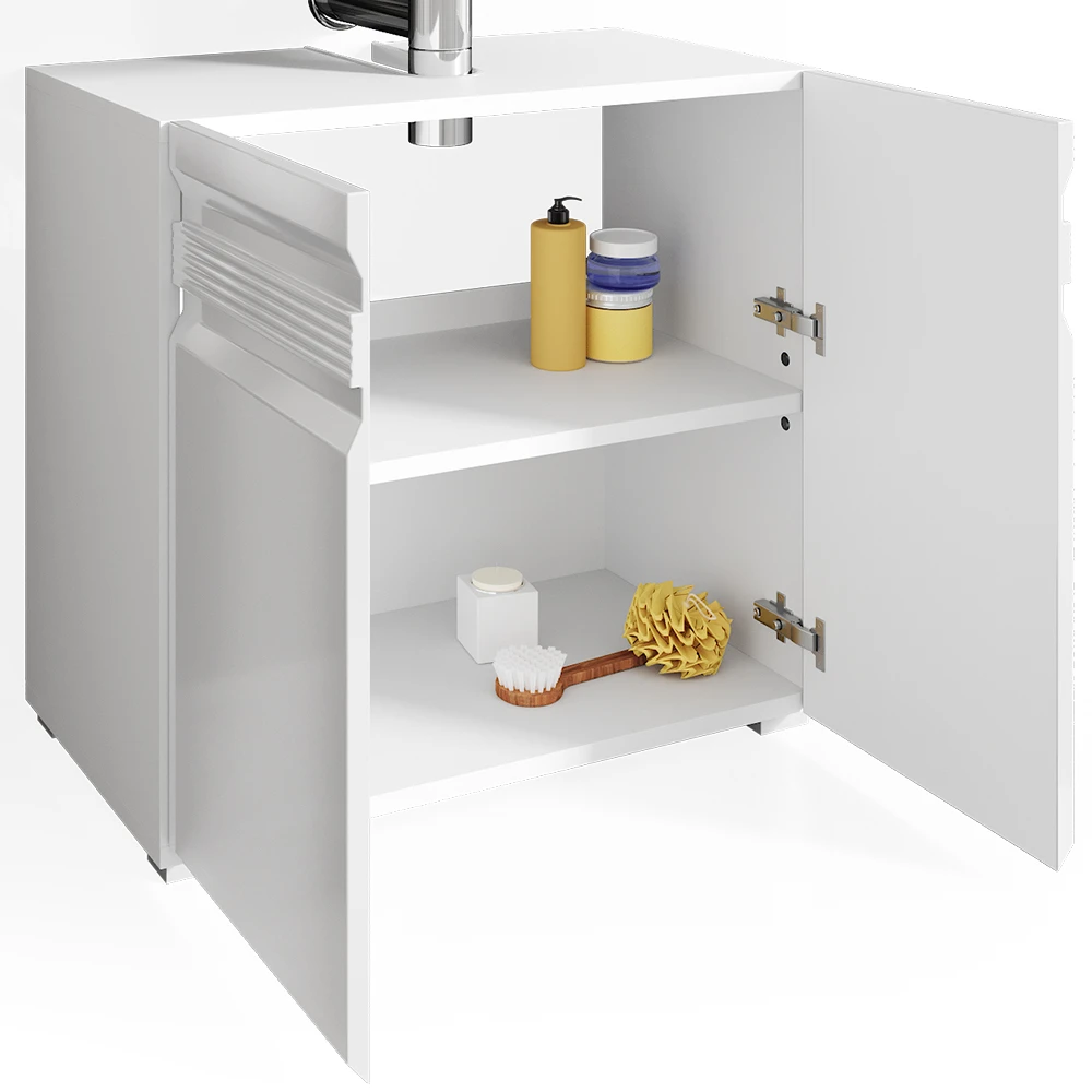 - Dieser Waschtischunterschrank hat zwei Flügeltüren und eine Aussparung für den Siphon. Er ist grifflos.