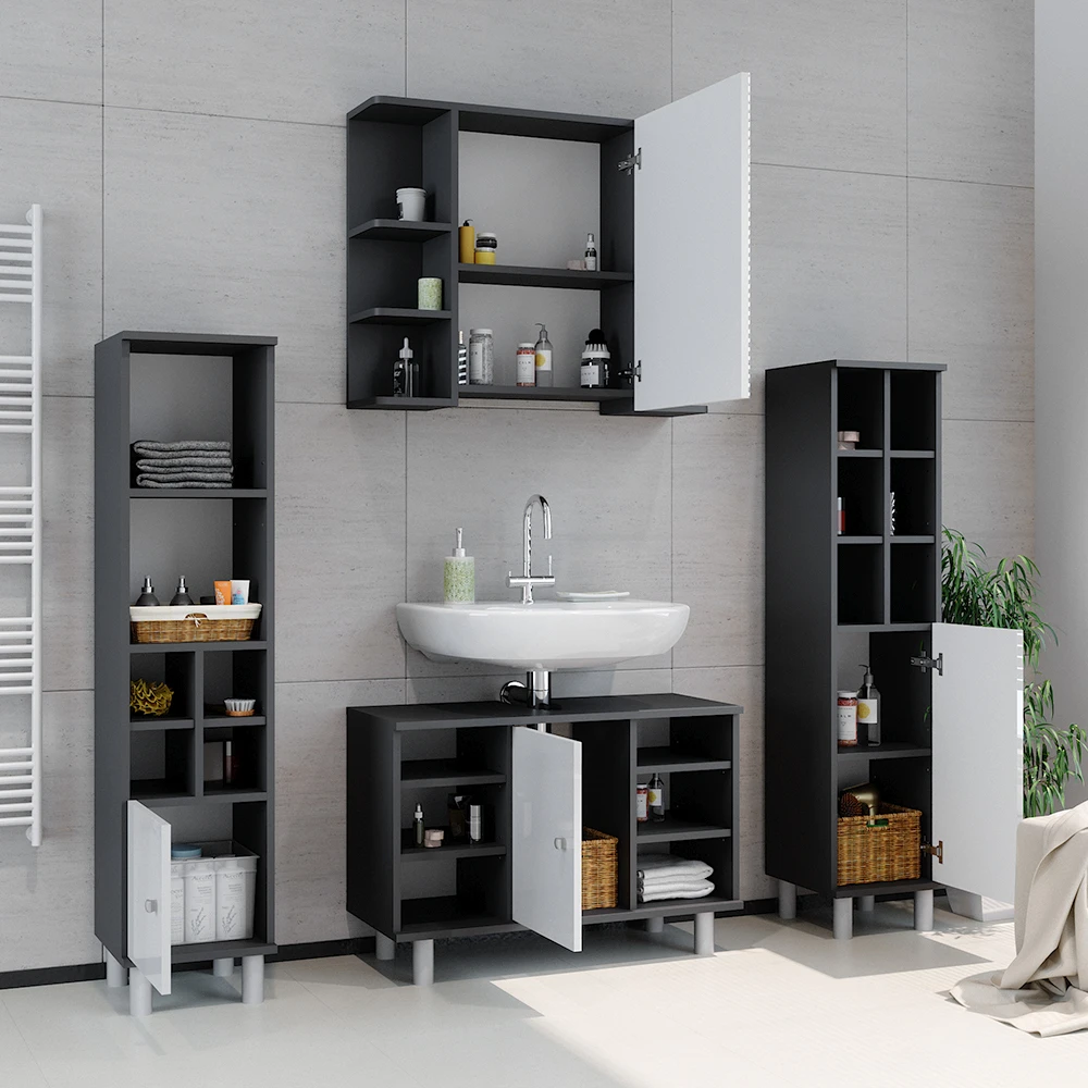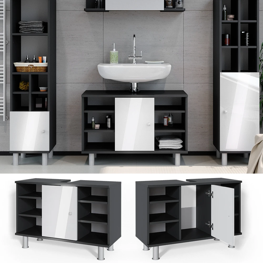 - Der Waschtischunterschrank hat eine Flügeltür und 6 offene Ablageflächen. Es gibt eine Aussparung für einen Siphon. Metallfüße sorgen für Standfestigkeit.