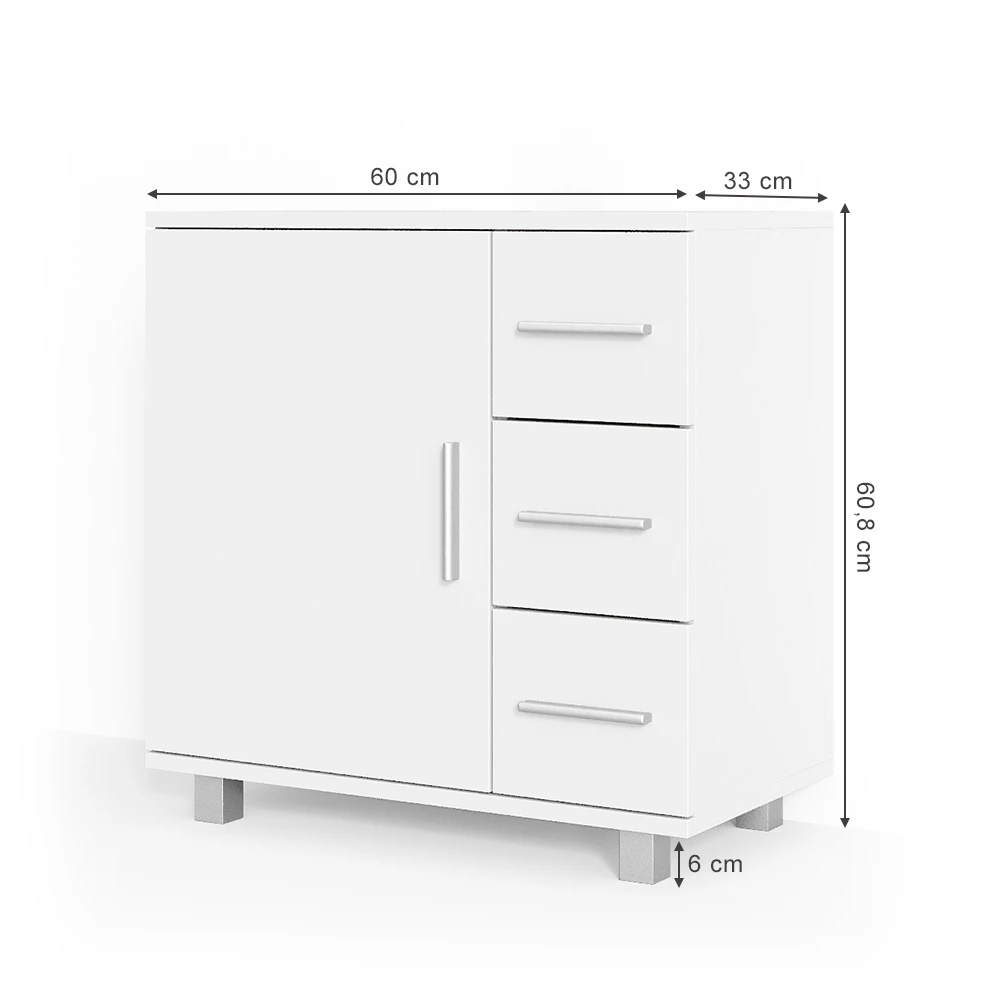 - MAßE: Der Unterschrank Badezimmer hat eine Breite von 60 cm, eine Höhe von 60,8 cm und eine Tiefe von 33 cm. Alle detaillierten Größen sind auf den Fotos angegeben.