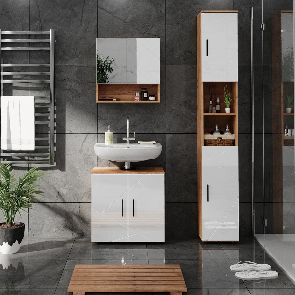 Die höhenverstellbaren Einlegeböden dieser Möbel bieten optimale Flexibilität, so können Sie Ihr Bad individuell einrichten. Modern, praktisch und hübsch verarbeitet – das ist unsere Badmöbelserie Irma.