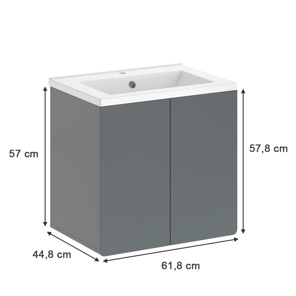 - MAßE: Der Unterschrank für das Badezimmer hat eine Breite von 57 cm, eine Höhe von 57,8 cm und eine Tiefe von 44,8 cm. Alle detaillierten Größen sind auf den Fotos angegeben.