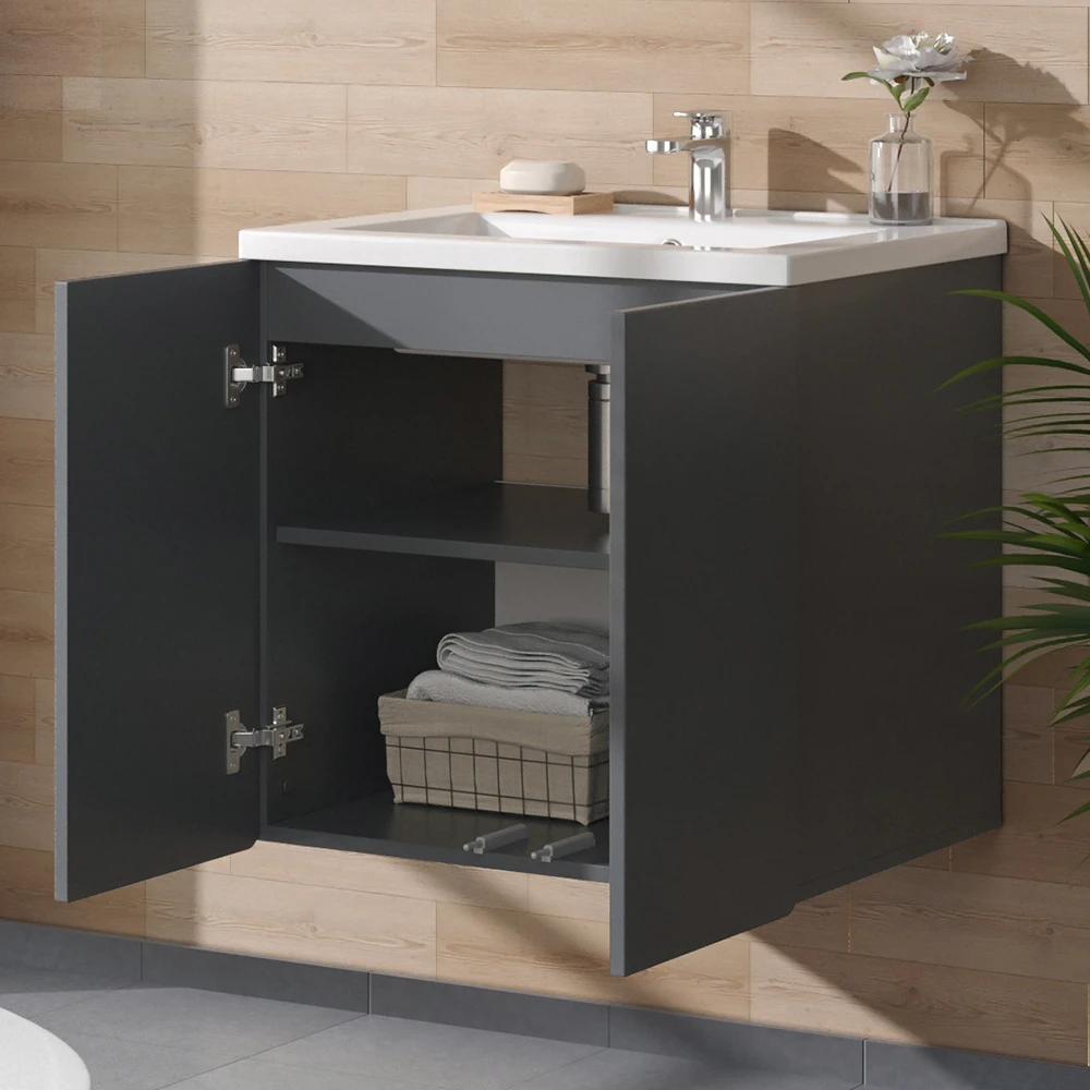 - Der Waschtischunterschrank verfügt über zwei Flügeltüren und eine praktische Aufhängung an der Wand.