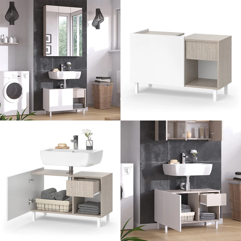 Mit seinem modernen, zweifarbigen Design ist dieser Waschtischunterschrank ein Blickfang in Ihrem Badezimmer. Dieser Waschtischunterschrank ist Teil der Arianna-Serie und integriert sich mühelos in Ihr Gesamtkonzept. Die pflegeleichte Oberfläche sorgt dafür, dass Ihr Badmöbelstück stets makellos aussieht und einfach zu reinigen ist. Die Montage gestaltet sich unkompliziert, dank der beigefügten Anleitung, und Sie können Ihren neuen Badunterschrank schnell in Betrieb nehmen.